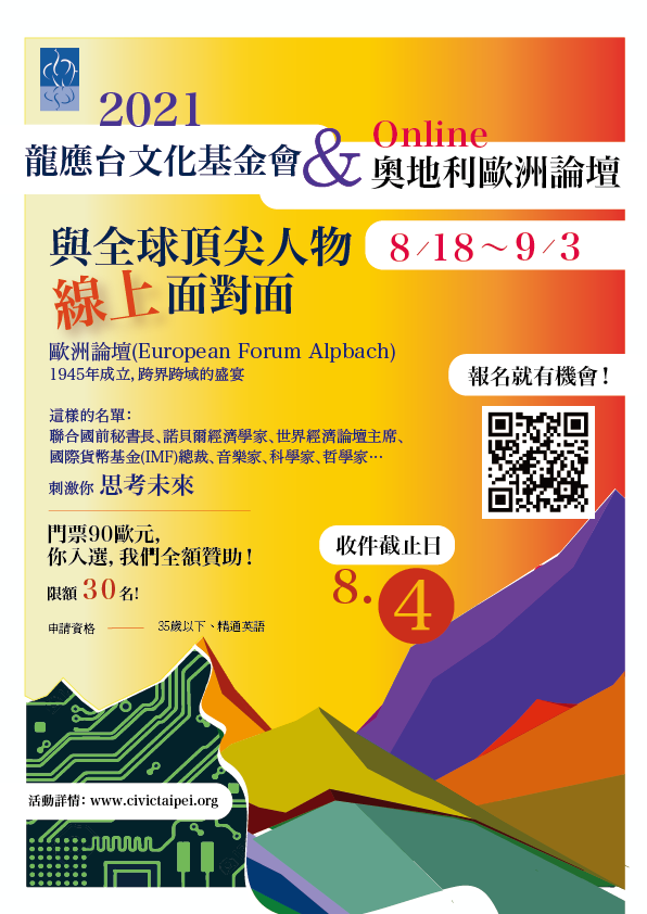 歐洲論壇之獎學金計畫一直以來都獲得廣大迴響,龍應台文化基金會爭取到線上參與〈2021年奧地利歐洲論壇〉的限量名額,將提供參與票給35歲以下的申請者。